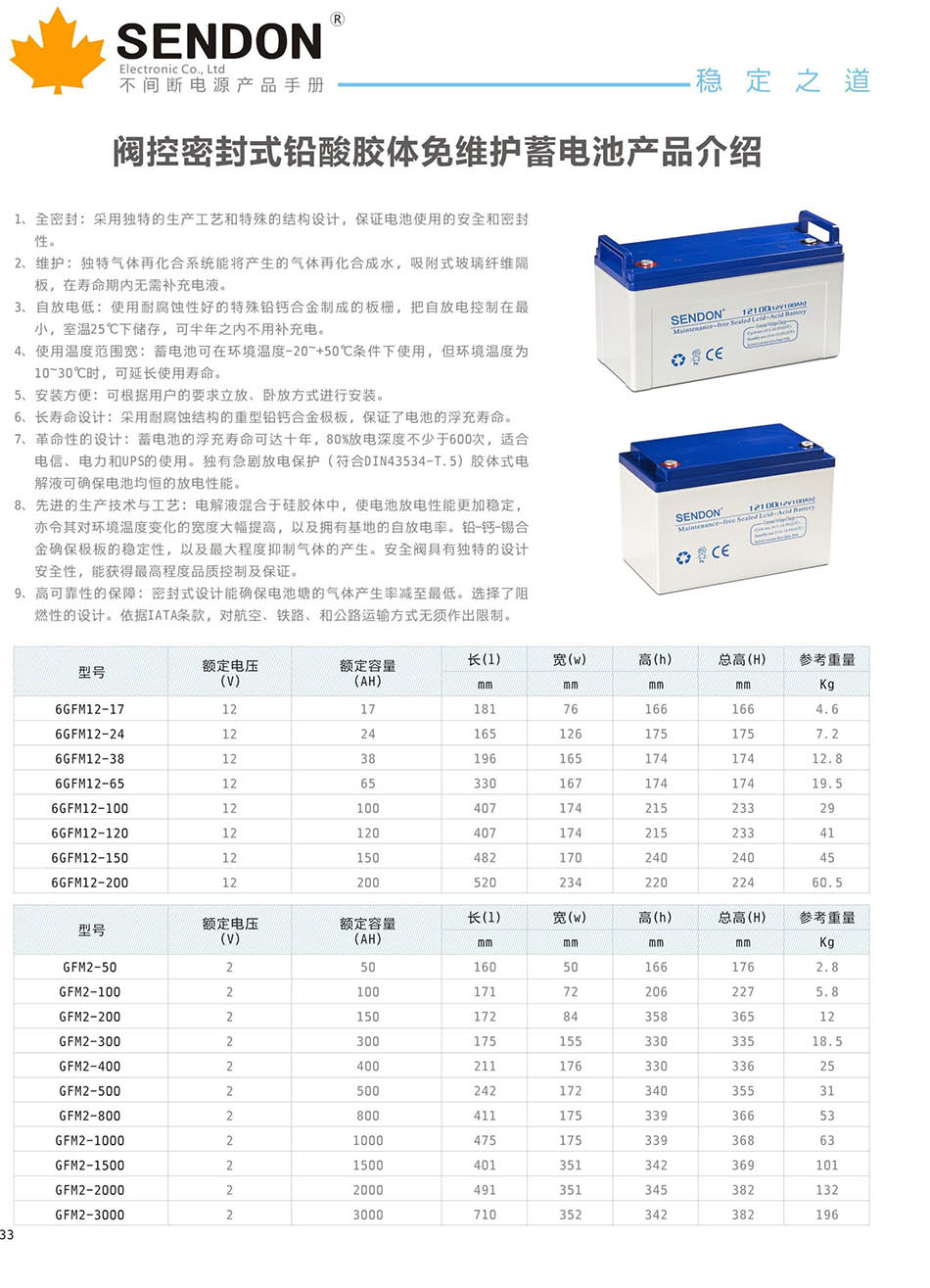 全寿命设计,采用耐腐蚀的重型铅钙合金极板,保证了电池的浮充寿命,蓄电池的浮充寿命可达十年,80%放电深度不少于600次,适合电信,电力和UPS的使用,有急剧放电保护,确保电池均恒的放电性能。
