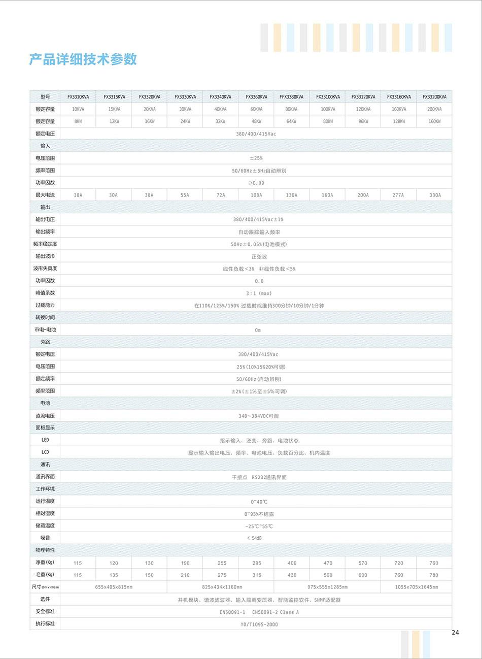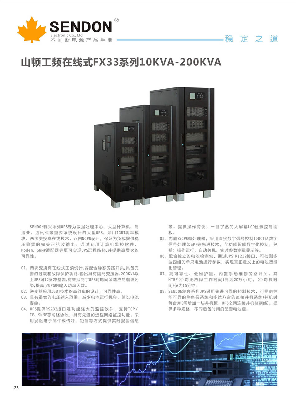 FX3310KVA-200KVA、输入电压:380V、输出电压:380V、电池配置:铅酸蓄电池、SENDON复兴系列UPS采用IGBT功率模块、两次变换真在线技术,双内NCPU设计,保证为负载提供稳压稳频的完美正弦波输出。通过专用计算机监控软件、Modem、SNMP适配器等更可实现UPS远程临控,并提供高层次的可靠性。