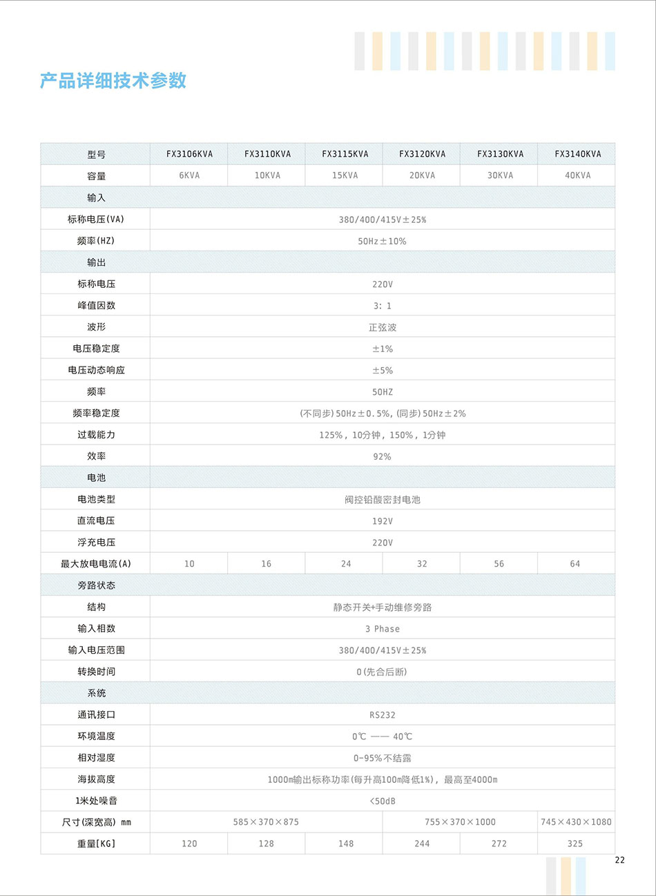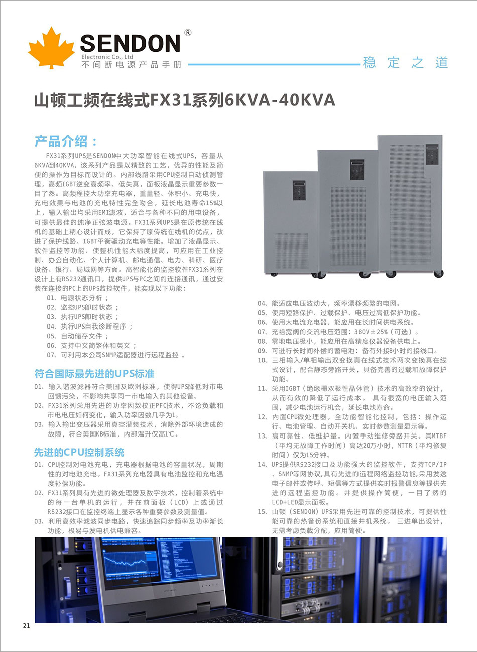工频机FX3106-40KVA、输入电压:380V、输出电压:220V、电池配置:外接铅酸蓄电池、SENDON复兴系列UPS采用IGBT功率模块、两次变换真在线技术,双内NCPU设计,保证为负载提供稳压稳频的完美正弦波输出。通过专用计算机监控软件、Modem、SNMP适配器等可实现UPS远程临控,并提供高层次的可靠性。