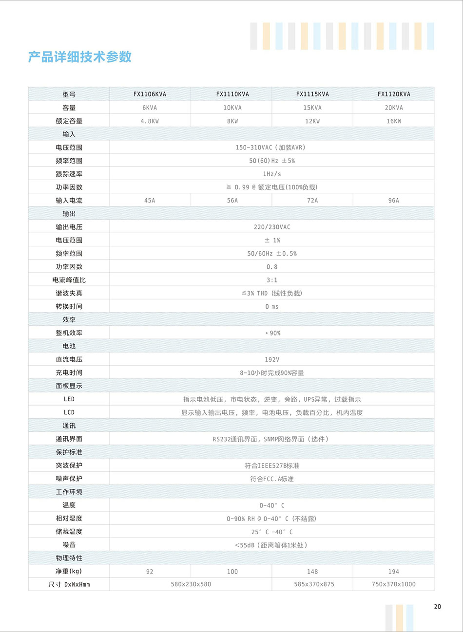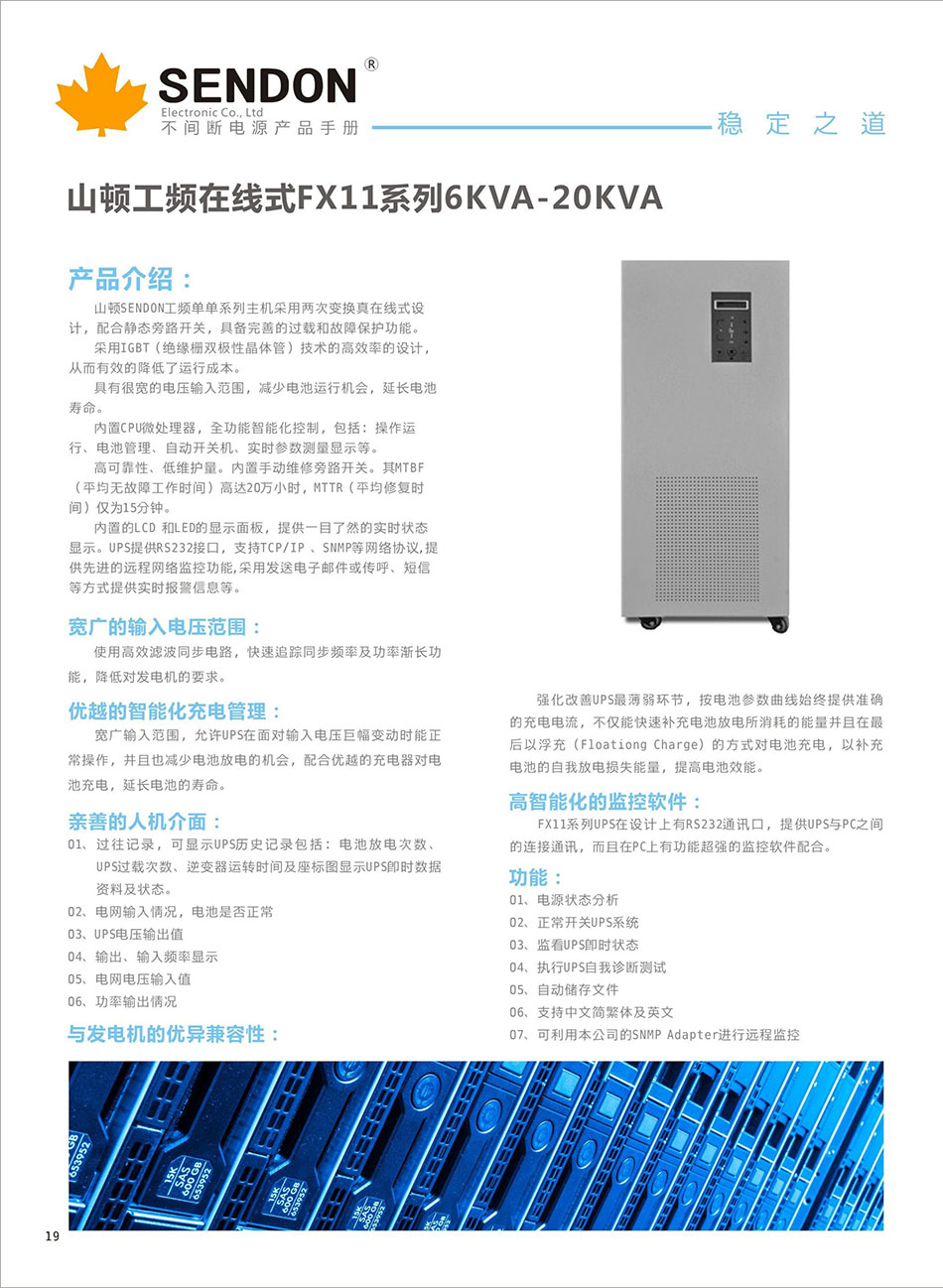 工频机FX1106-20KVA、输入电压:220V、输出电压:220V、电池配置:铅酸蓄电池、山顿SENDON工频单单系列主机采用两次变换真在线式设计,配合静态旁路开关,具备完善的过载和故障保护功能。 采用IGBT(绝缘栅双极性晶体管)技术的高效率的设计,从而有效的降低了运行成本。 具有很宽的电压输入范围,减少电池运行机会,延长电池寿命。