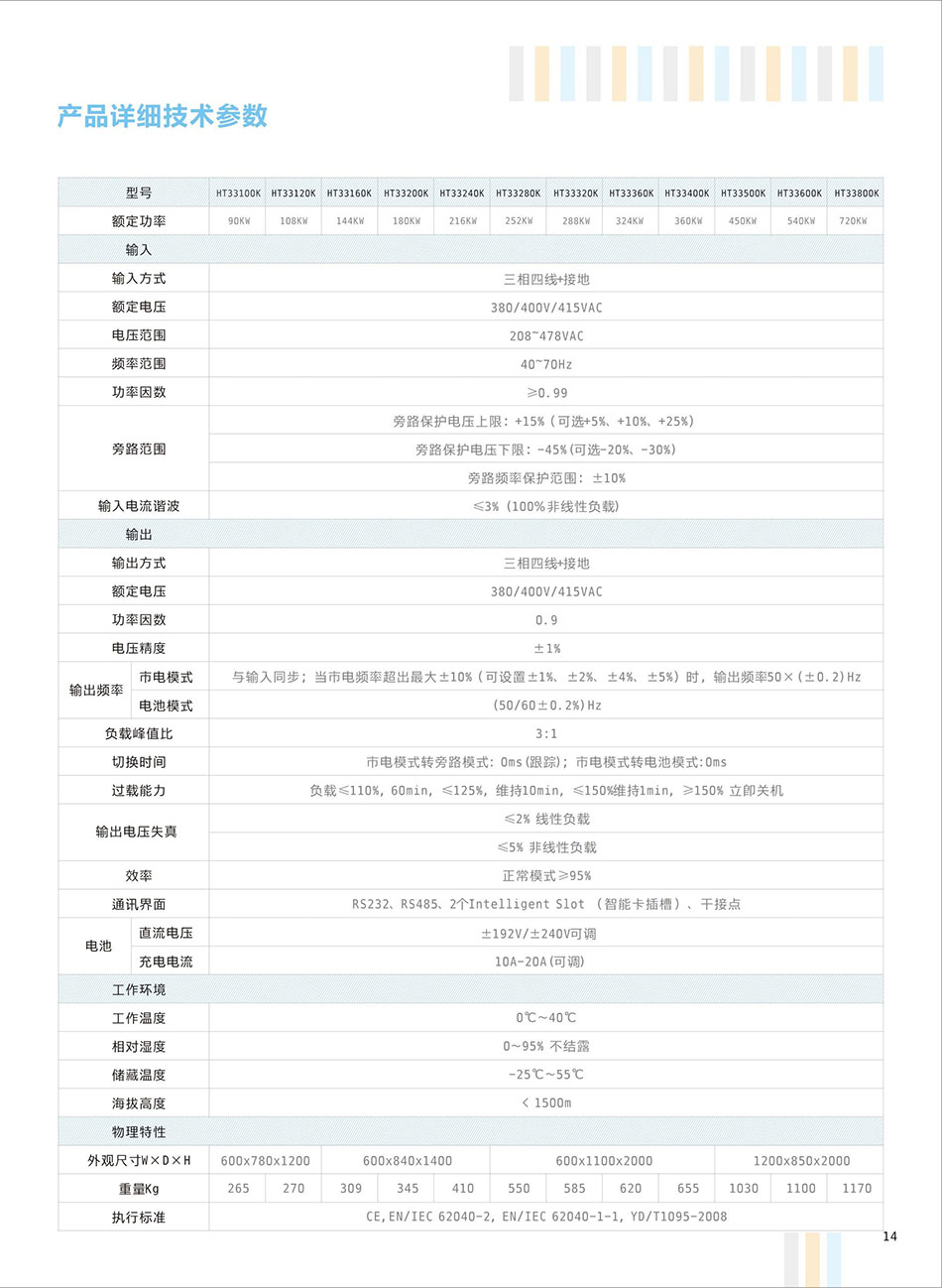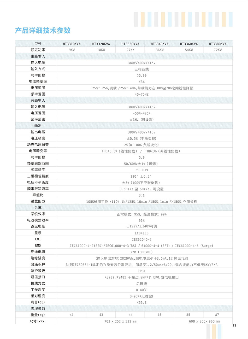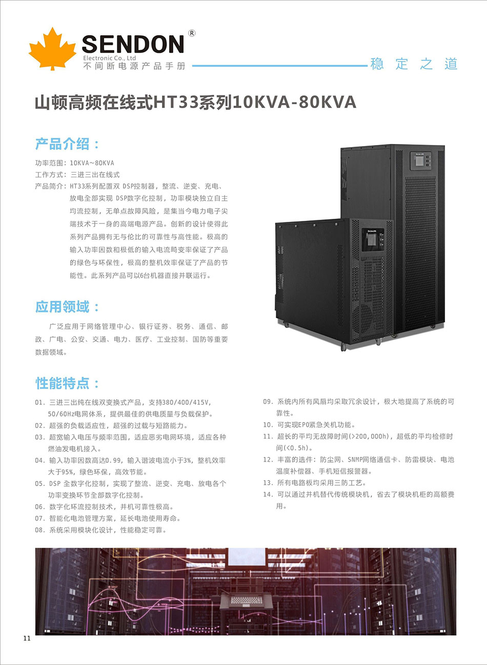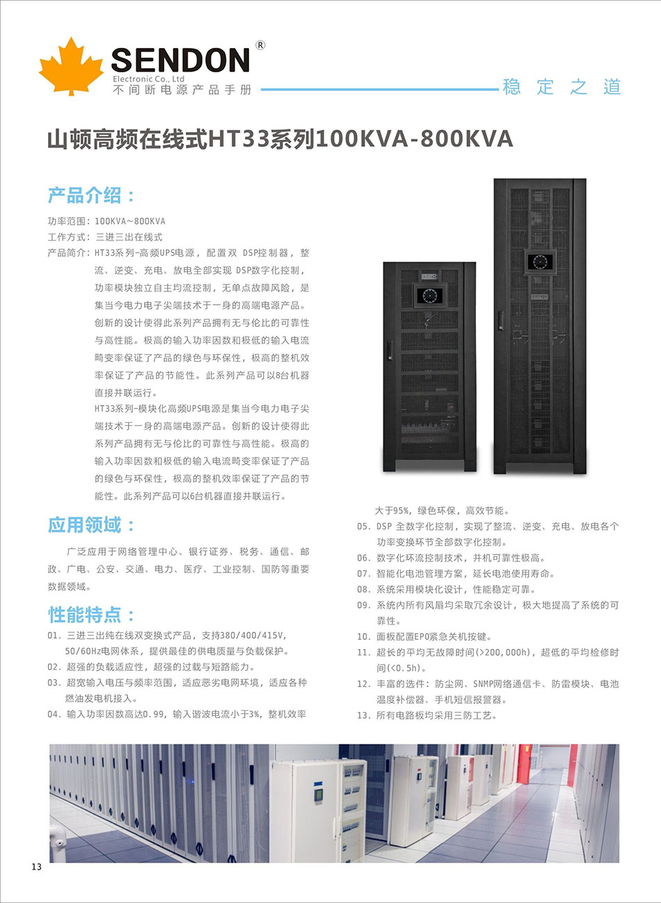 HT3310K-HT33800KVA、输入电压:380V、输出电压:380V、电池配置:铅酸蓄电池、HT33系列-高频UPS电源,配置双 DSP控制器,整流、逆变、充电、放电全部实现 DSP数字化控制,功率模块独立自主均流控制,无单点故障风险,是集当今电力电子尖端技术于一身的高端电源产品。创新的设计使得此系列产品拥有无与伦比的可靠性与高性能。极高的输入功率因数和极低的输入电流畸变率保证了产品的绿色与环保性,极高的整机效率保证了产品的节能性。此系列产品可以6台机器直接并联运行。