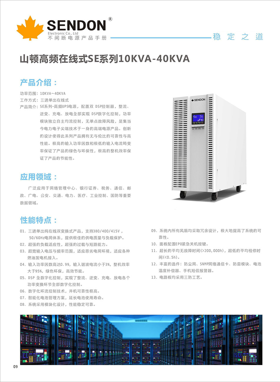 SE10K-40KVA、输入电压:380V、输出电压:220V、电池配置:外接铅酸蓄电池、山顿SE系列 UPS电源采用双转换纯在线式的架构,该架构能够阻隔异常电源对负载的冲击,同时还能保证输出的稳定\可能,让负载安全的运行,有效解决所有电源问题的架构设计,为用户提供电源规划的弹性和安全的保障.