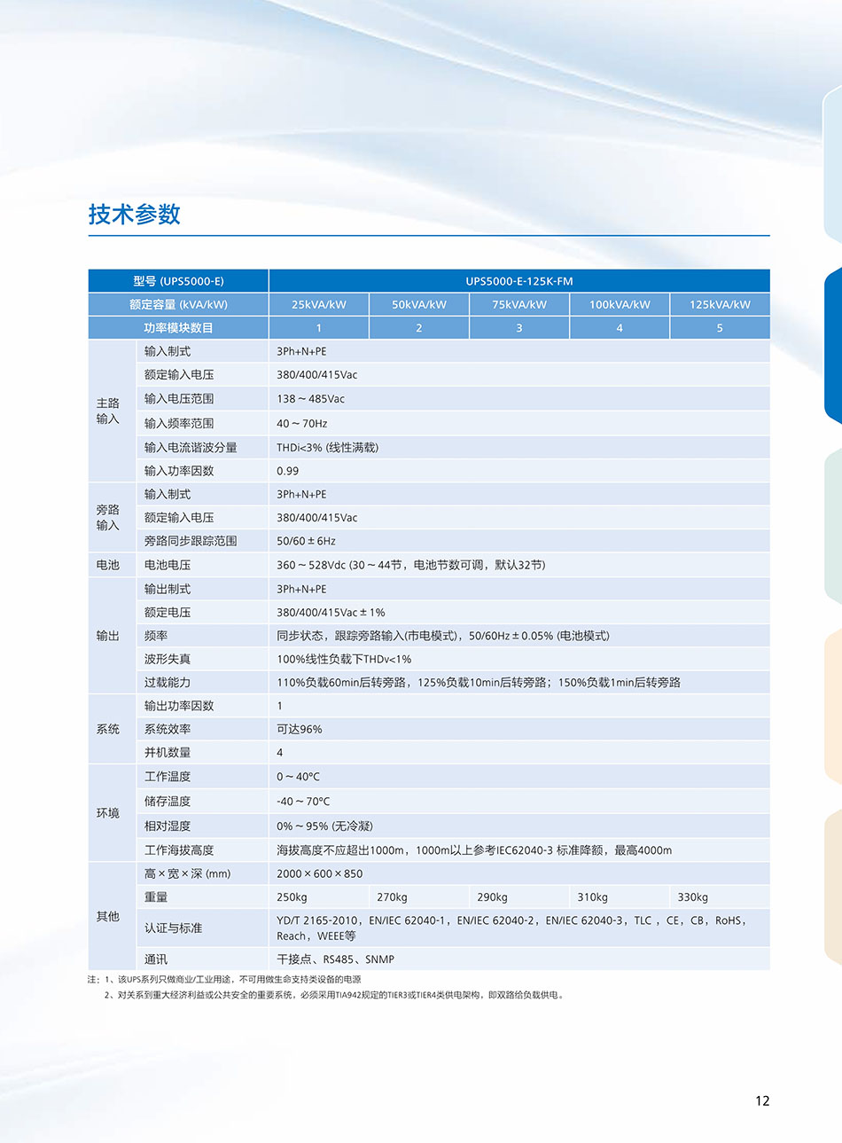 UPS5000-E25-120K、输入电压:380V、输出电压:380V、电池配置:铅酸蓄电池、UPS5000-E系列是专为中大型数据中心等场景而设计的模块化不间断电源UPS5000-E系列基于全模块化热插拔设计,单机最大可扩容至800kVA,最快5分钟完成维护或扩容,轻松实现边成长边扩容,大幅提升系统可用性。效率在20%负载即可达到95%,40%负载即可达到96%,更加匹配数据中心真实业务场景。可为用户提供更加可靠、弹性、高效的供电保障。