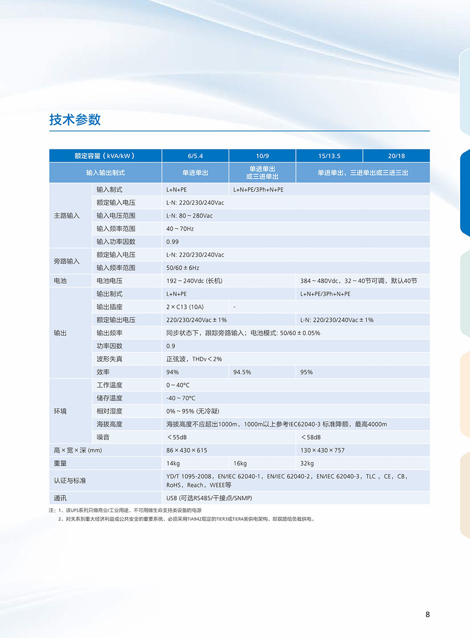 UPS2000-G-6-20KRTL-S、输入电压:380V、输出电压:220V、电池配置:铅酸蓄电池、产品描述:•输入端口防浪• 涌及独有D级防雷设计,大幅降低雷击失效率 •80-280Vac超宽电压输入范围,176-280Vac不降额,80Vac •可带40%负载,减少转电池次数,延长电池寿命 •母线电容、风扇、电池等关键部件失效前预警。