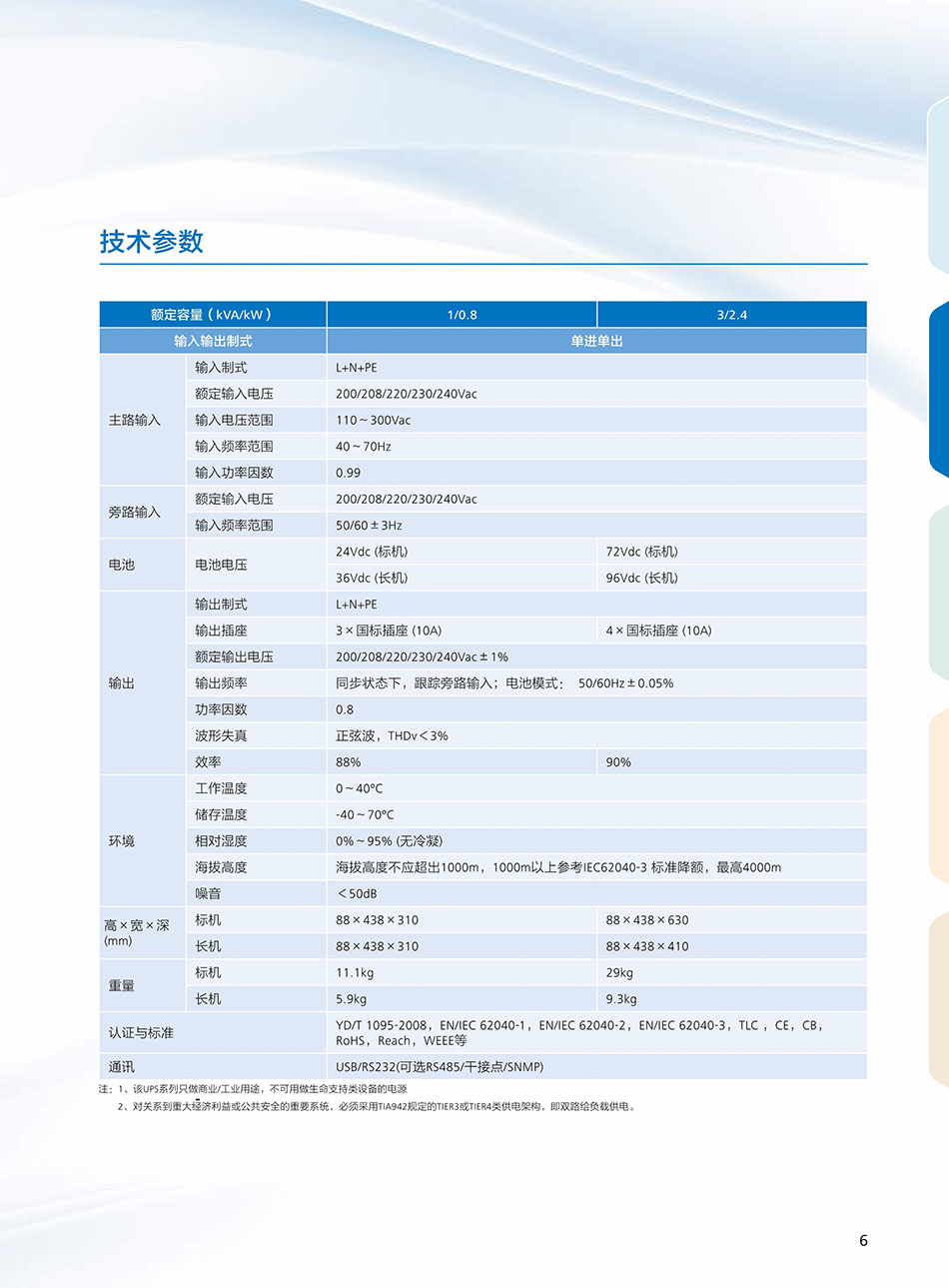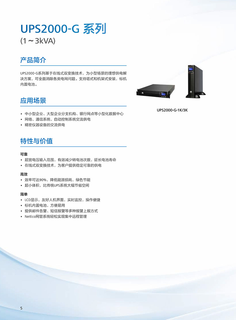 UPS2000-G-1-3KRTL-S、输入电压:220V、输出电压:220V、电池配置:铅酸蓄电池、产品描述:UPS2000-G系列基于在线双变换技术,为小型场景的理想供电解决方案,可全面消除各类电网问题。UPS2000-G系列涵盖了1-20KVA的容量范围,支持机架式和塔式安装,效率最高可达95%,并以其优异的效率特性获得英国政府颁发的EAC节能认证与全球首批“能源之星”认证。华为ups,华为UPS电源,不间断电源,华为网络能源,华为ups电源官网,节能实力广受认可,为客户提供绿色供电。