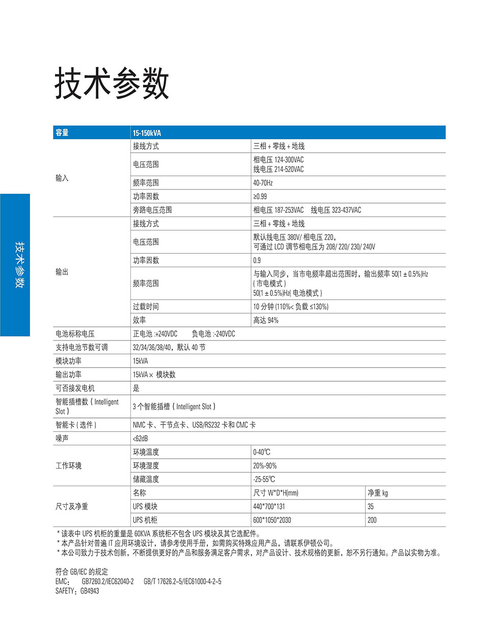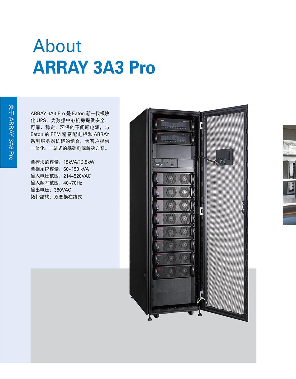 ARRAY3A3PT(60kVA~600kVA)、输入电压:380V、输出电压:380V、电池配置:铅酸蓄电池、· 与锂电池完美集成,兼容多种锂离子电池管理系统 (BMS),数据中心的电池管家,储能型UPS,不仅仅是UPS· 高功率密度,低占地(1.32m^2),与 ARRAY 3A3 PT 200*3 相比节省 50%· 灵活组合,按需配置,边成长边投资,降低CPEX,热同步并机支持模块内部,外部并机,垂直方向最大10个模块,水平方向支持8 台并机,大4.8MW· 高效率。