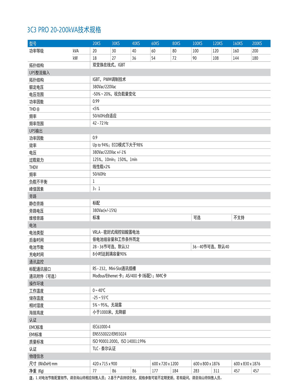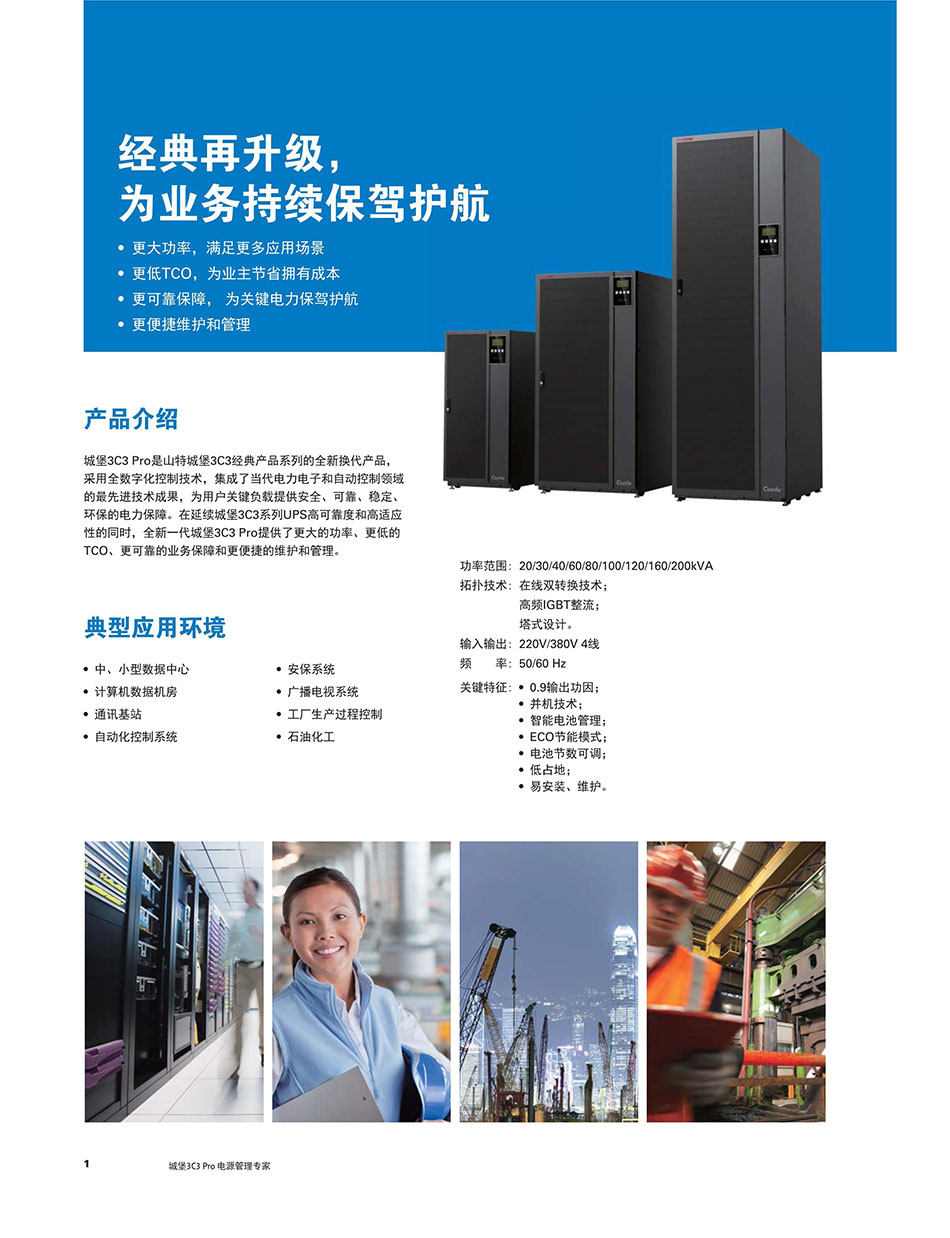 3C3PRO20-200KS、输入电压:380V、输出电压:380V、电池配置:铅酸蓄电池、城堡3C3 Pro是山特城堡3C3经典产品系列的全新换代产品,采用全数字化控制技术,集成了当代电力电子和自动控制领域的技术大成果,为用户关键负载提供安全、可靠、稳定、环保的电力保障。在延续城堡3C3系列UPS高可靠度和高适应性的同时,全新一代城堡 3C3 Pro 提供了更大的功率、更低的TCO、更可靠的业务保障和更便捷的维护和管理。