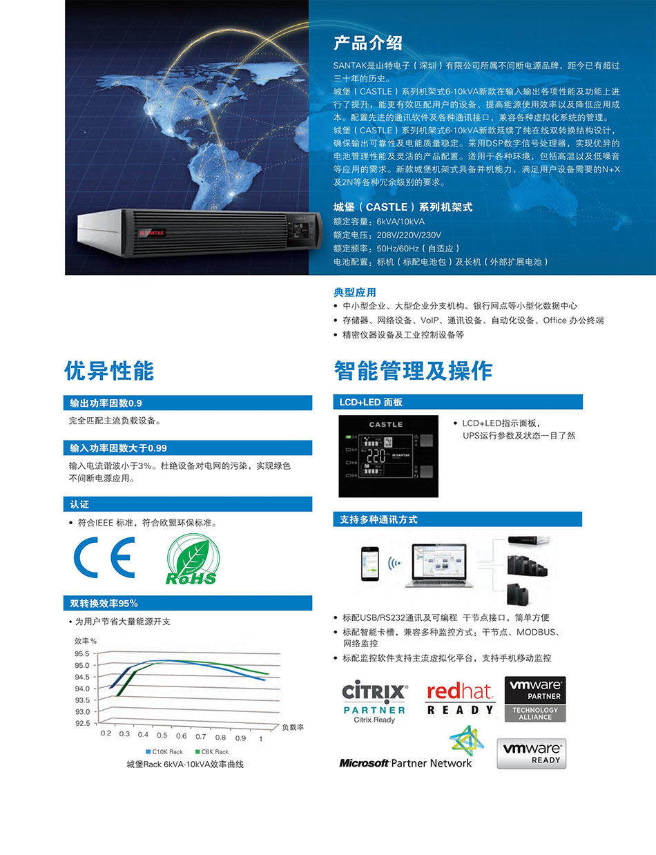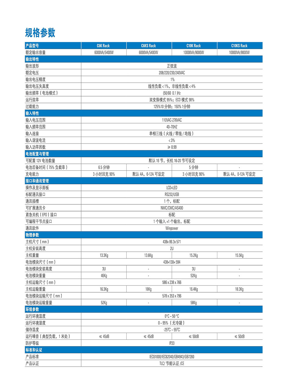 C6KR(S)-C10KR(、输入电压:220V、输出电压:220V、电池配置:铅酸蓄电池、城堡系列机架式是一款继承上一代城堡系列UPS 的优秀品质,并在其基础上表现更加出色的双转换在线式UPS。在有效解决9种电力问题(断电、市电电压过高或过低、电压瞬间跌落或减幅震荡、高压脉冲、电压波动、浪涌电压、谐波失真、杂波干扰、频率波动)的基础上,C6-10kVA大幅提高了其在可靠性、高效性、适应性和灵活性等方面的表现,全方位满足了用户对稳定且不间断电力的需求。同时,其所具备的丰富的可扩展功能。
