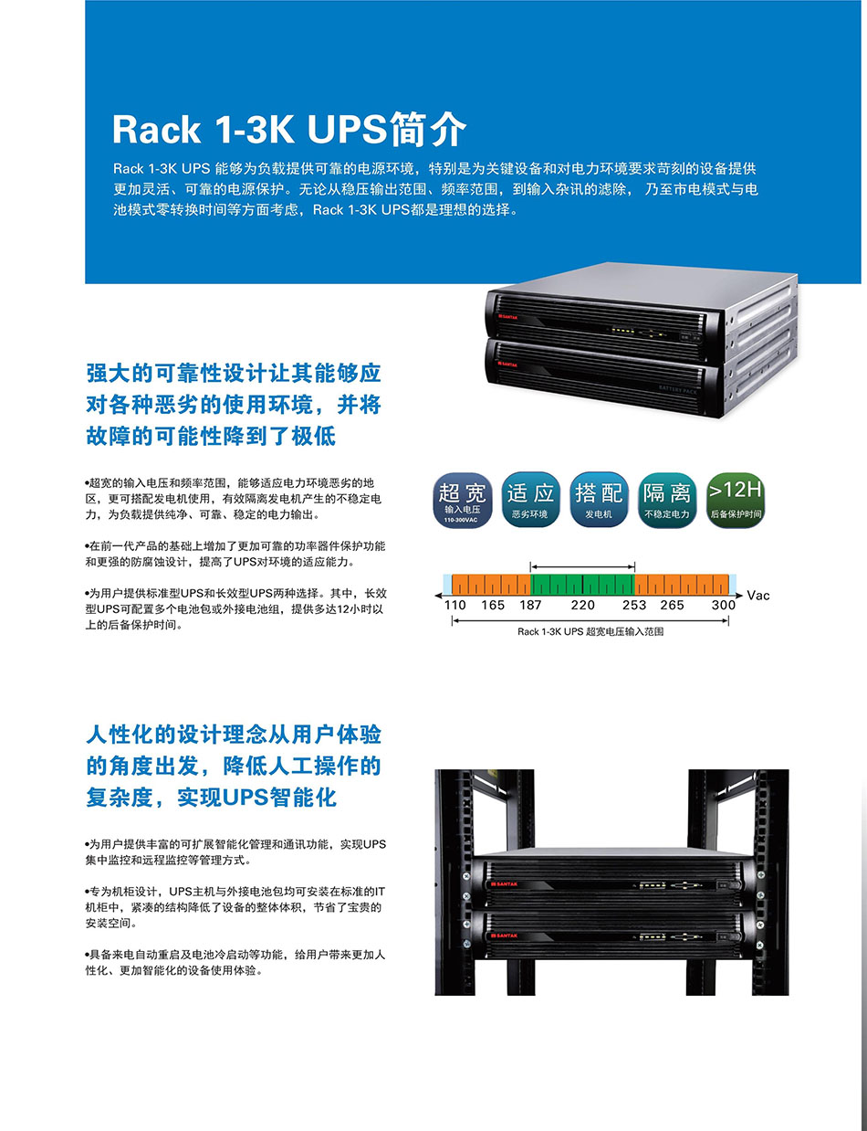 C1KR(S)-C3KR(S)、输入电压:220V、输出电压:220V、电池配置:铅酸蓄电池、城堡系列机架式是一款继承上一代城堡系列UPS 的优秀品质,并在其基础上表现更加出色的双转换在线式UPS。在有效解决9种电力问题(断电、市电电压过高或过低、电压瞬间跌落或减幅震荡、高压脉冲、电压波动、浪涌电压、谐波失真、杂波干扰、频率波动)的基础上,C1-3kVA大幅提高了其在可靠性、高效性、适应性和灵活性等方面的表现,全方位满足了用户对稳定且不间断电力的需求。同时,其所具备的丰富的可扩展功能。