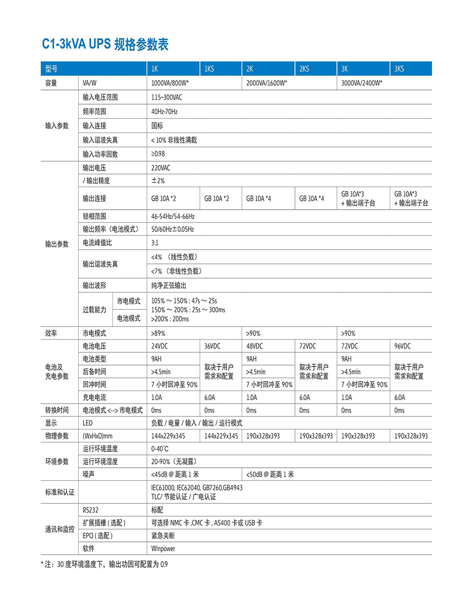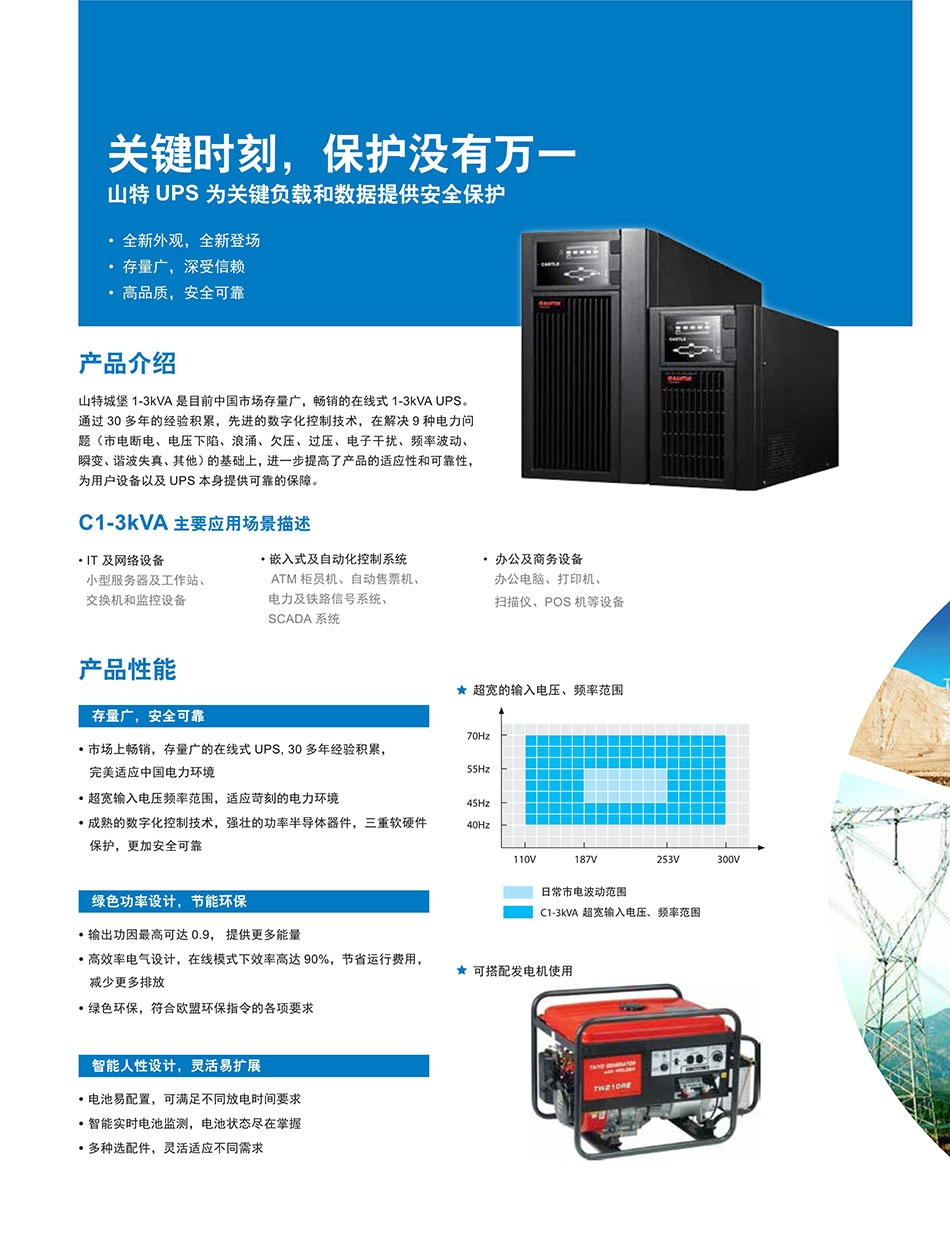C1K(S)-C3K(S)、输入电压:220V、输出电压:220V、电池配置:铅酸蓄电池、城堡系列塔式C1KS-c3ks 是一款继承上一代城堡系列UPS 的优秀品质,并在其基础上表现更加出色的双转换在线式UPS。在有效解决种电力问题(断电、市电电压过高或过低、电压瞬间跌落或减幅震荡、高压脉冲、电压波动、浪涌电压、谐波失真、杂波干扰、频率波动)的基础上,大幅提高了其在可靠性、高效性、适应性和灵活性等方面的表现,全方位满足了用户对稳定且不间断电力的需求。同时,其所具备的丰富的可扩展功能。