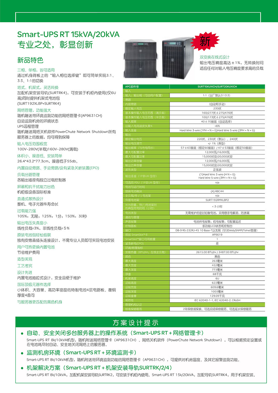 SURT15-20KUXICH、输入电压:380V、输出电压:220V、电池配置:铅酸蓄电池、APCUPS电源有那些负载不适合使用施耐德APCUPS电源在使用过程中注意事项 APC机架式UPS电源为基站提供电源保障。