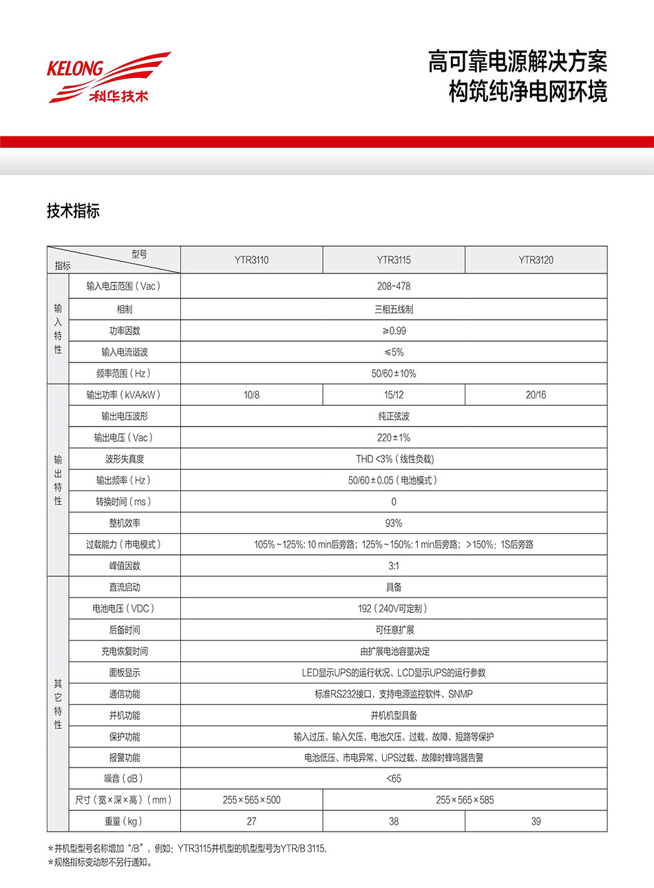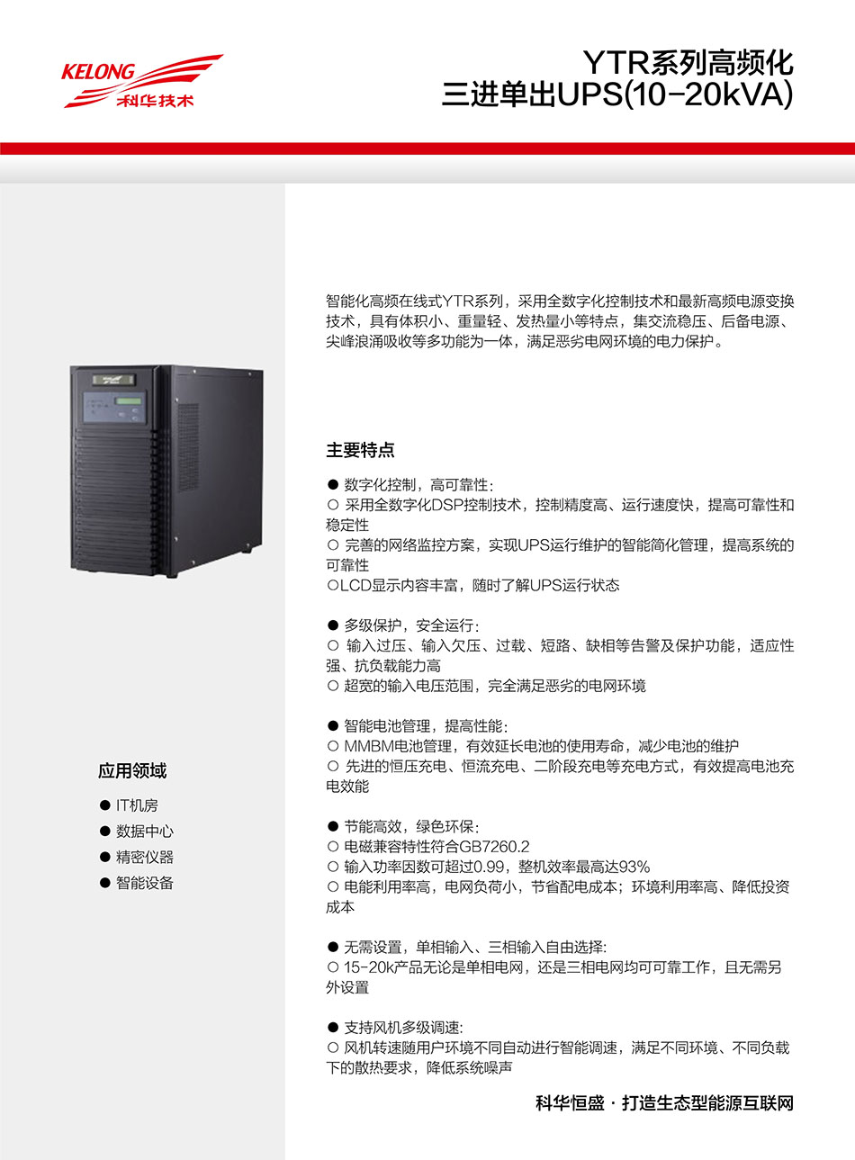 型号:YTR10-20K、输入电压:380V、输出电压:220V、电池配置:铅酸蓄电池、高可靠性High Reliability全数字控制技术强电网环境适应性绿色安全完善的告警保护功能节绿色电源 双向保护性能 优异指标智能友好Intelligent & Friendly大显示高清屏幕 视觉体验 安装使用 灵活方便丰富的干接点信号和通讯功能电池管理 Battery Management 超长后备保障 持续续航智能电池